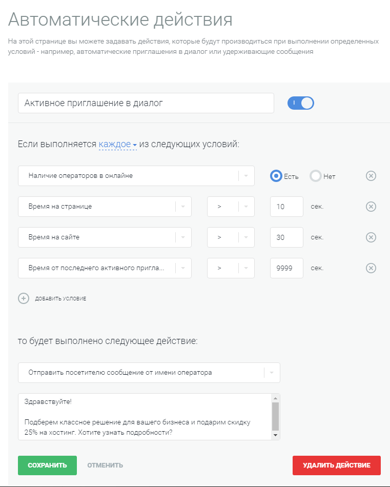 - Время от последнего активного приглашения — практически бесконечность. Это означает, что если посетитель сознательно закрыл чат, приглашение к диалогу он больше не увидит.